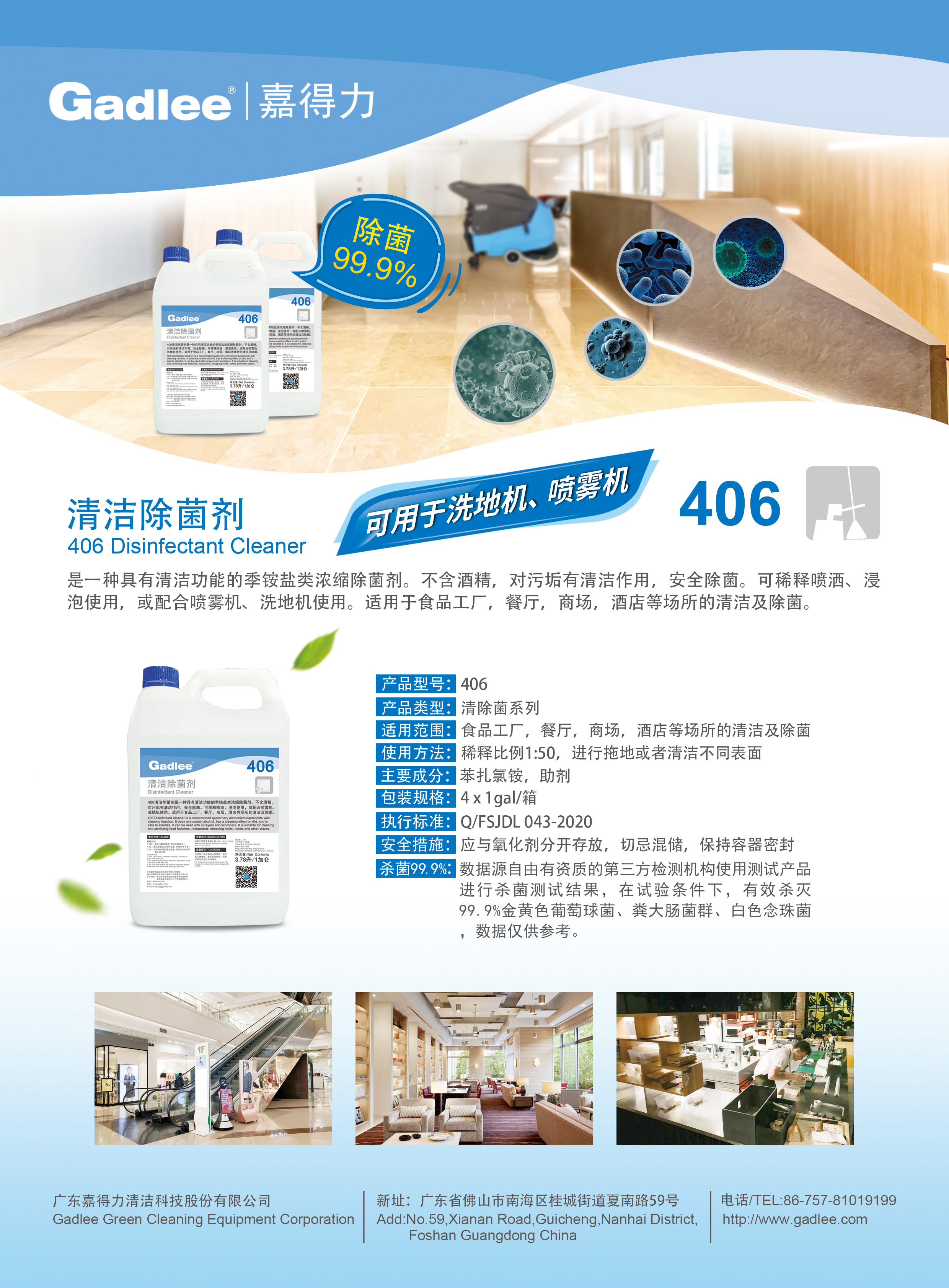 是一种具有清洁功能的季铵盐类浓缩消毒剂。不含酒精,对污垢有清洁作用,安全除菌。可稀释喷洒、浸泡使用,或配合喷雾机、洗地机使用。适用于医院,食品工厂,餐厅,商场,酒店等区域的清洁及消毒。