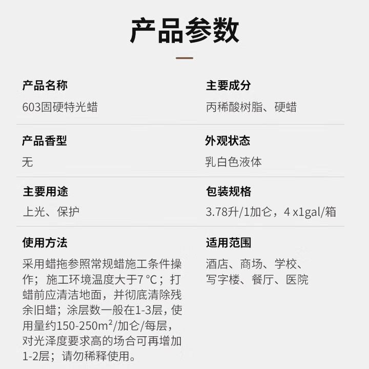 采用先进的纳米级聚合物乳液,加以超高分子量耐磨聚合物树脂配制而成,其拥有独特的超低气味特性的同时具有超强的附着力、坚硬度、光亮度,能提供具有良好光亮度及坚硬耐用的蜡面,提高环境美观,方便清洁保养;蜡面坚韧,适用性强,有效防刮;使用方便,干燥速度快,使用效率高,节省劳力投入,适用于医院、学校等各种对环境要求较高的场合。