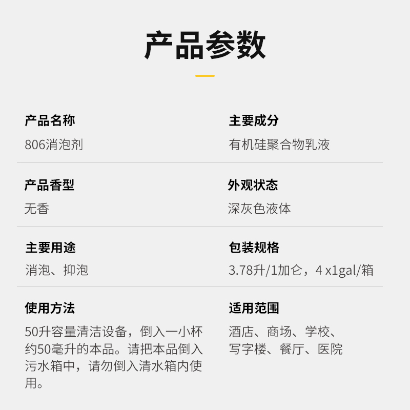 本品为高效浓缩、快速作用的消泡剂,能立即消除清洁过程中产生的泡沫;持续有效的抑泡成份能充分利用您的清洁设备的水箱容量,且保护设备。