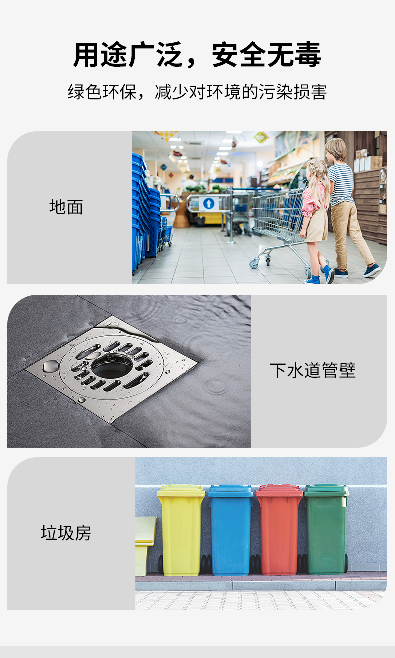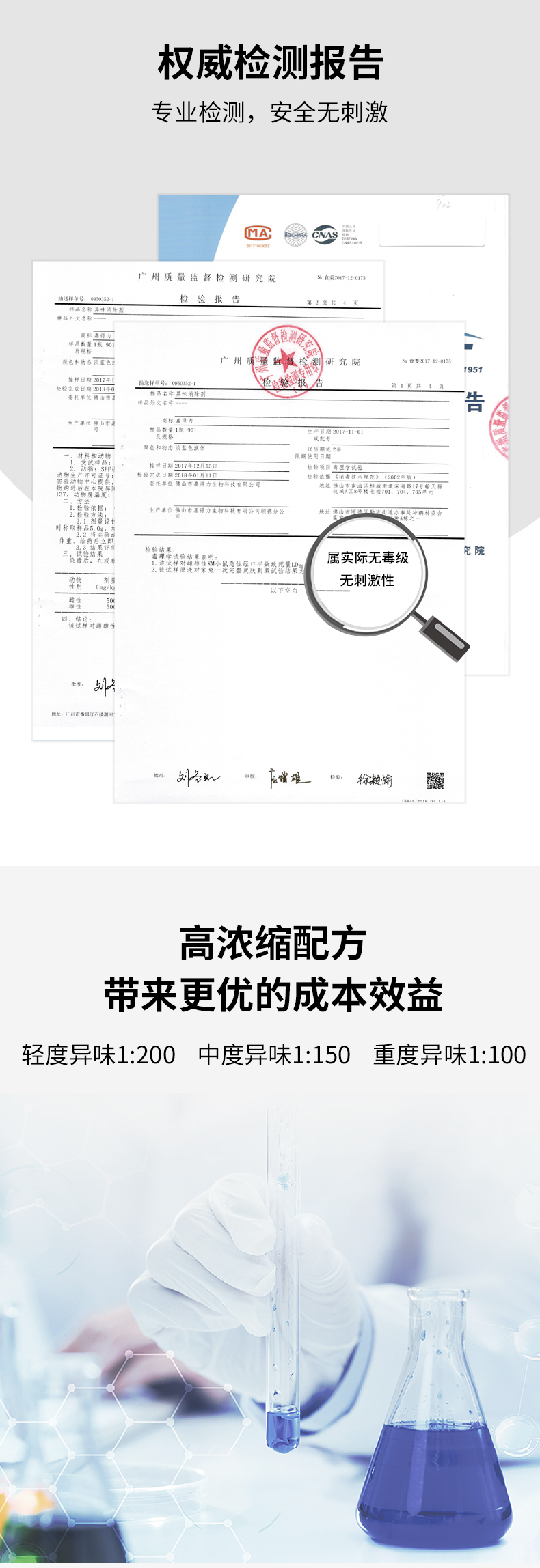 一种直接喷洒于臭源表面的无毒环保除臭剂,源头除臭,根治异味。该产品超浓缩,便于运输,无毒、无刺激性,没有环境污染,对金属无腐蚀,可直接排入污水管线,可持续数日。