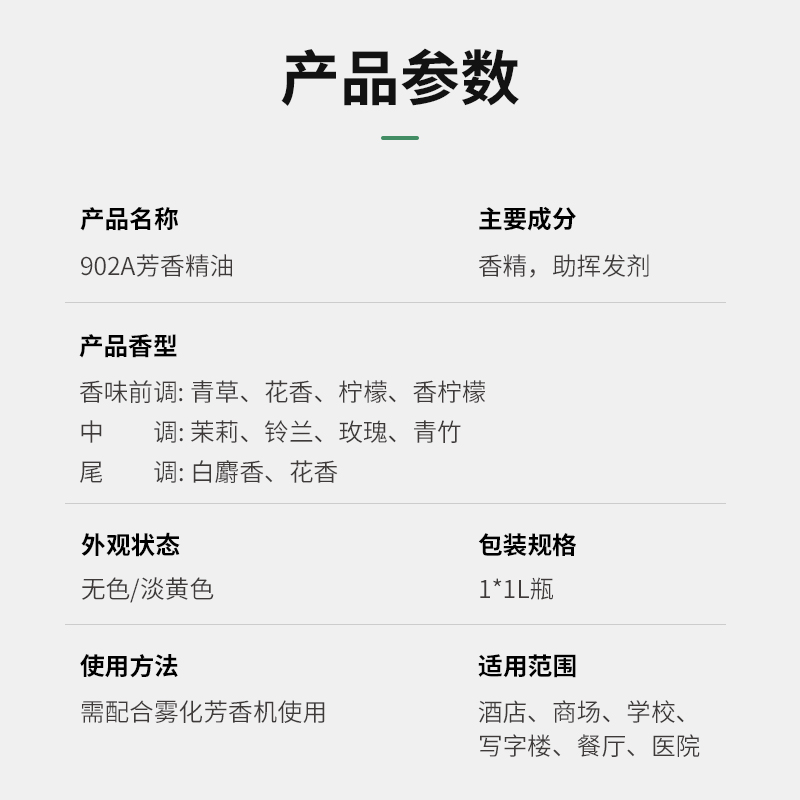 902A芳香精油:是一种制造气味芬芳的精油产品。在产生芳香氛围的同时,利用多种去异味分子成分对抗异味。通过中和自然反应,形成新的气味小分子阻断异味气味。