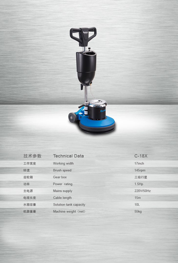嘉得力多功能单刷机 / 石材翻新机专为高强度工作而设计,C-18X 多功能单刷机,适用于硬地面清洁、地毯清洁等多种清洁任务,M-18XL 为强度大的石材翻新、晶面处理,为大理石、石灰石、花岗岩等石材护理以及硬地面、地毯清洗提供方案。