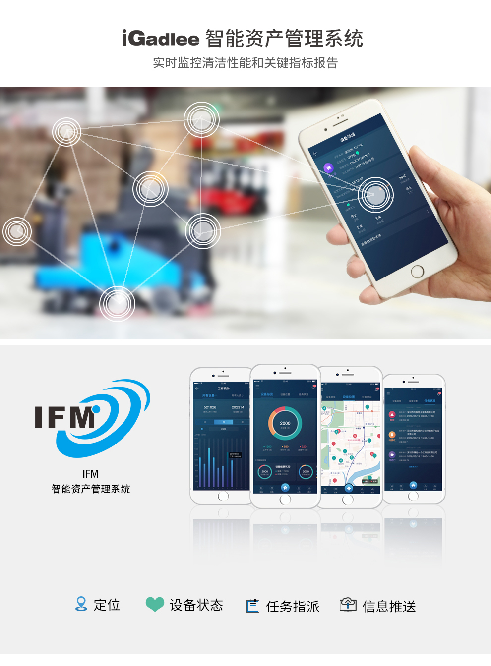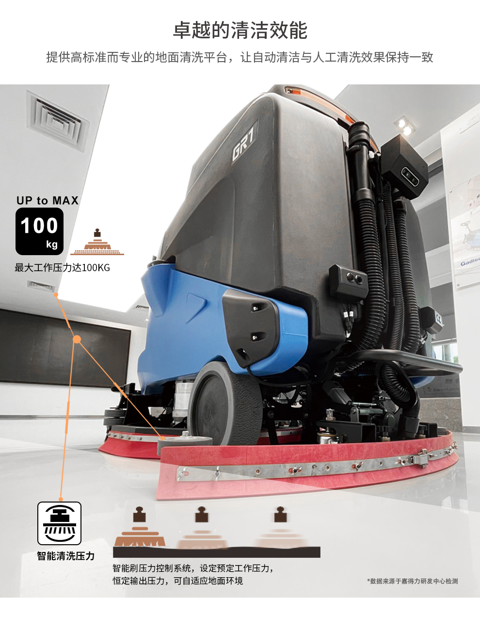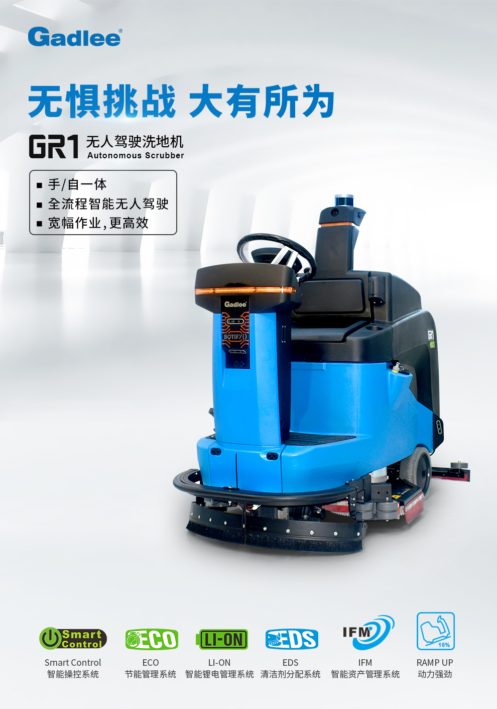 GR1 无人驾驶洗地机满足工商业地面清洗需求。其采用全方位视野感知和智能无人高级运算技术应用,为大面积场所提供无人自动清洗方案。