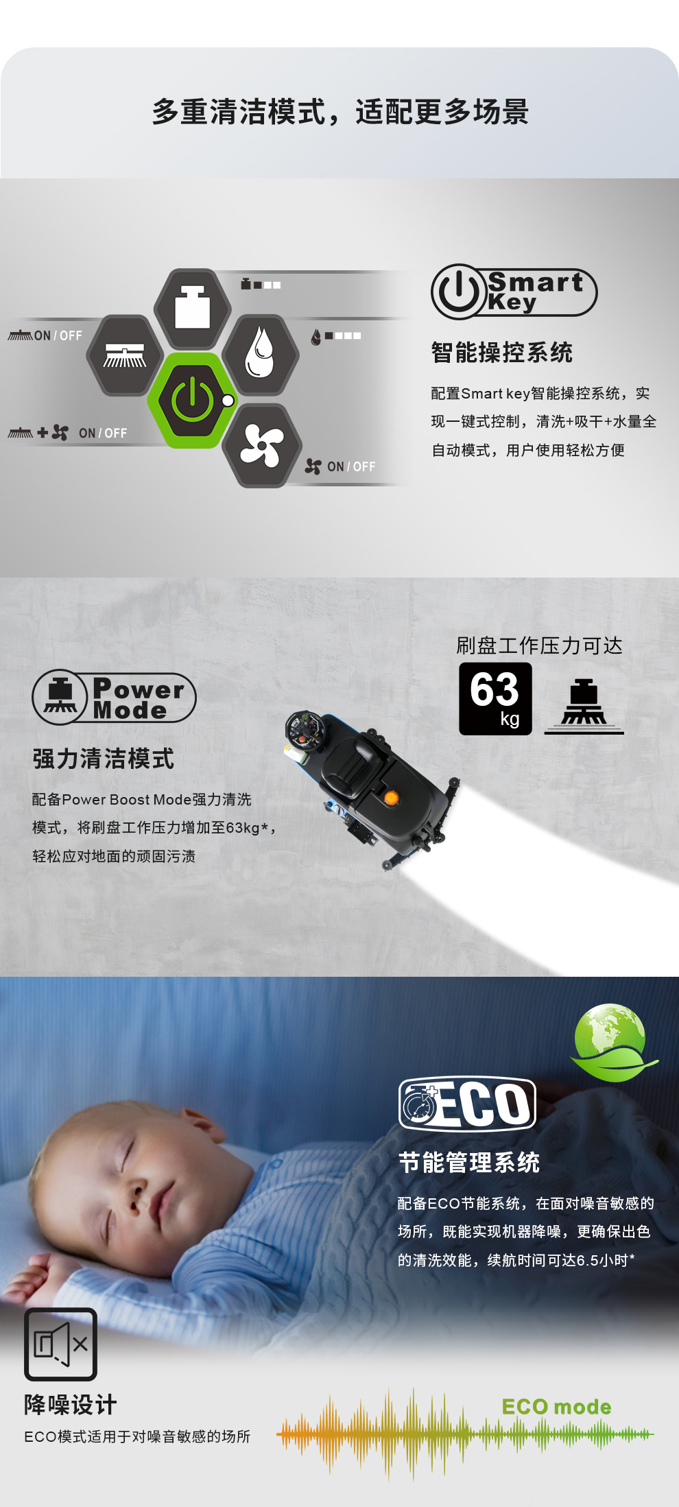 - 三个自动工作模式(洗 / 吸 / 洗 + 吸)