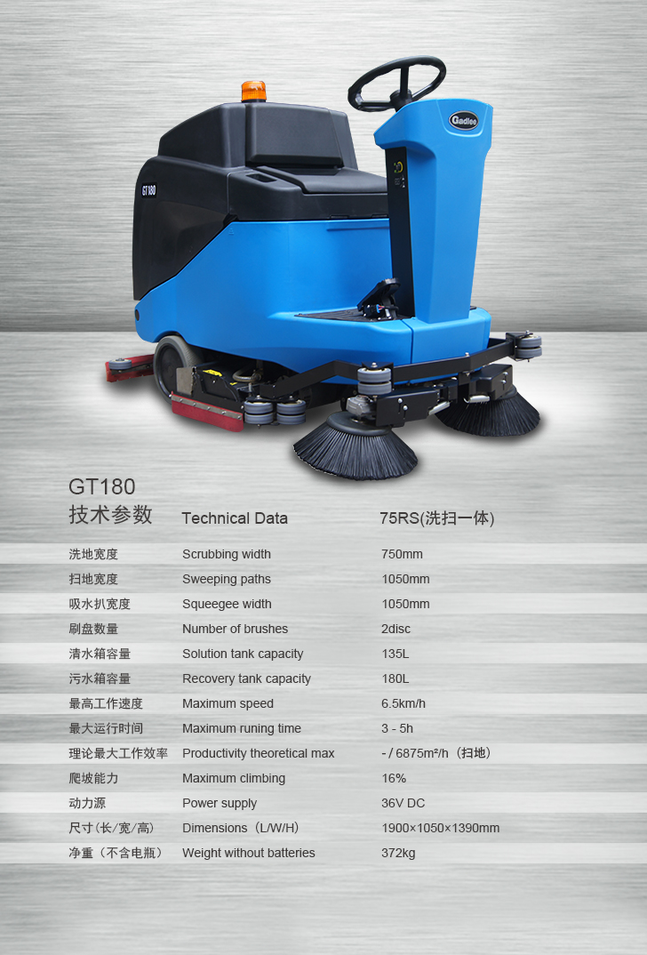 Gadlee GT180 驾驶式洗地机系列提供较高的稳定性及耐用性,适合不同类型的地面清洗任务。配合不同的刷子、百洁垫及其他附件,满足不同类型的地面清洗需要。GT180 系列为大型商业地面清洗:例如购物中心、机场候机楼;同样也适合工业,例如大型物流仓库、生产车间使用。