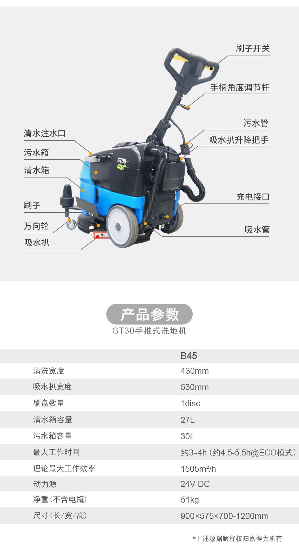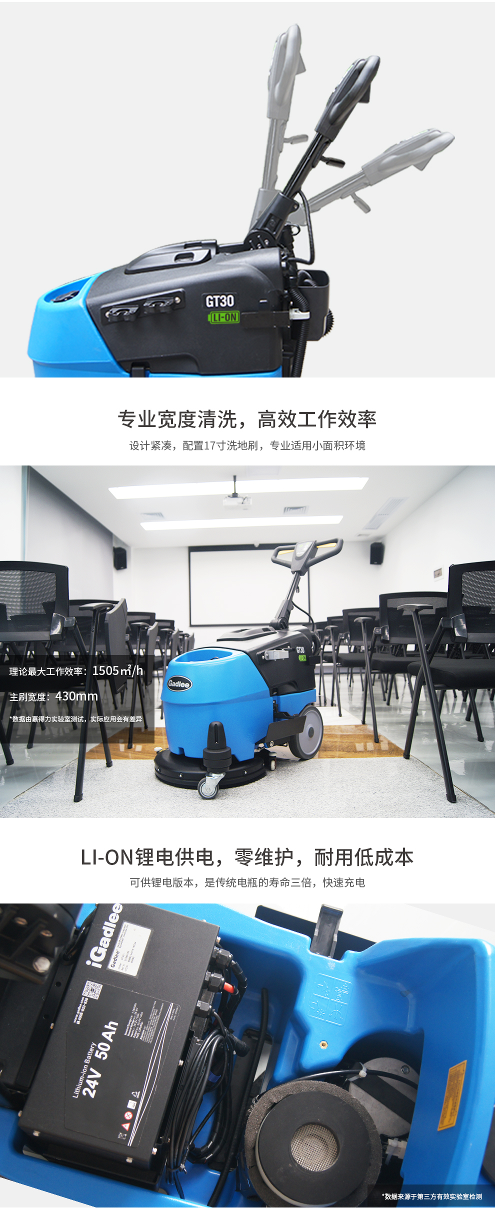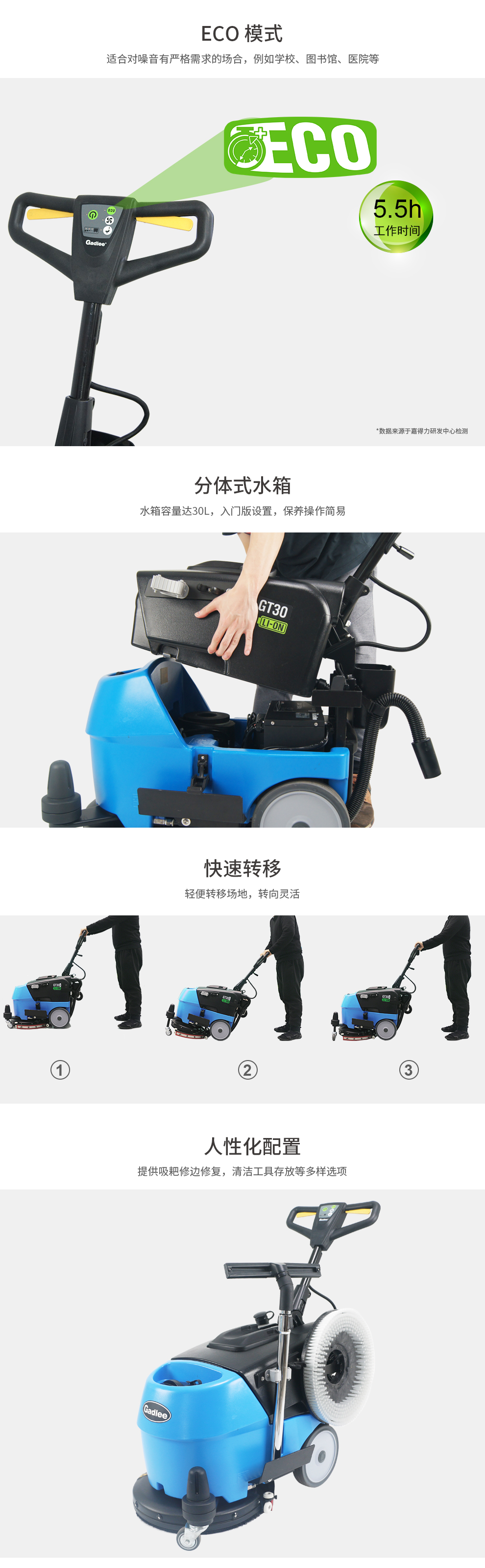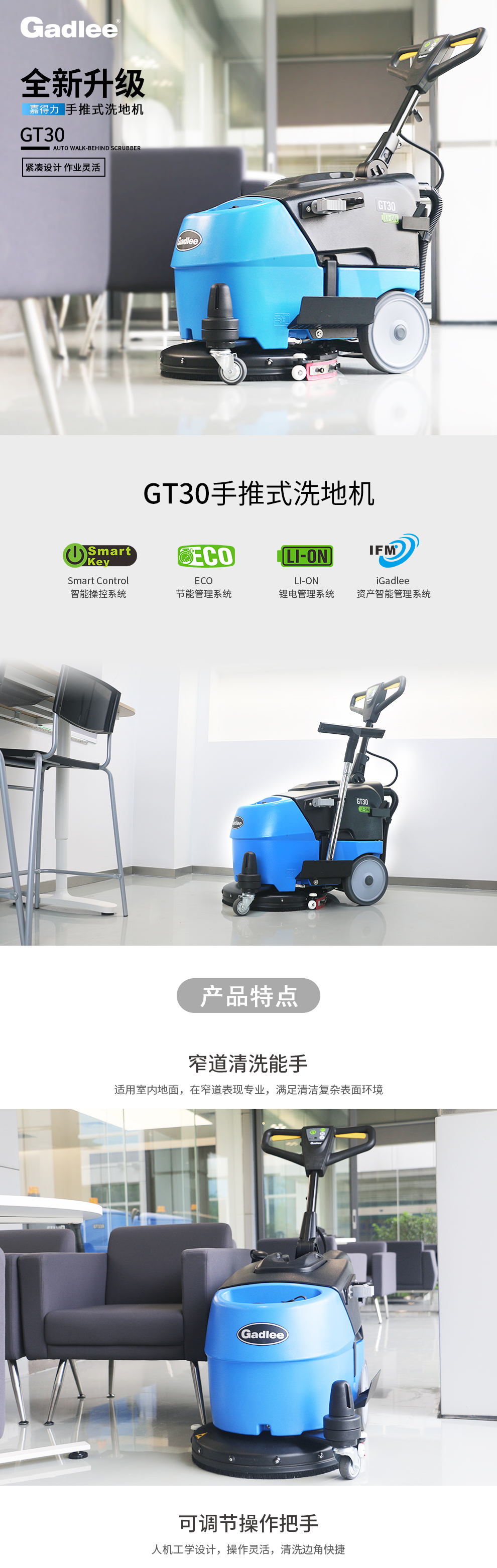 GT30手推式洗地机设计紧凑且操作灵活,却能提供如大型洗地机般的专业清洗性能。 配置可调式手柄,为清洁提供更多灵活性,同时兼顾较长的工作时间。 GT30专业的设计确保优秀的清洗和吸干效果,令清洁任务变得轻松和快捷,为广大的清洁承包商提供一个集动力清洁、高效及易于使用的专业清洗解决方案。