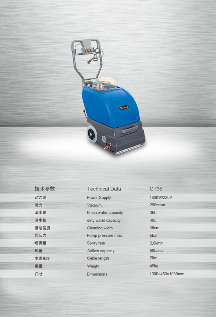 GT35滚刷式的地毯三合一抽洗机。配备前后吸水系统,及前进或后退清洗系统,集喷液、刷洗、吸干功能一次性完成,是用于清洗大面积地毯的配套机器。