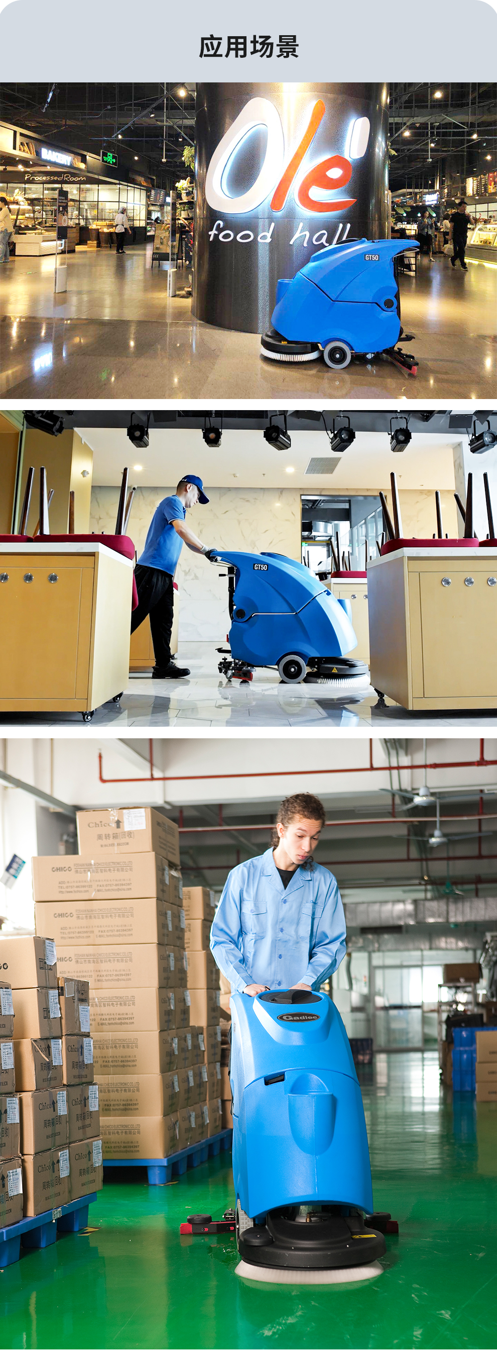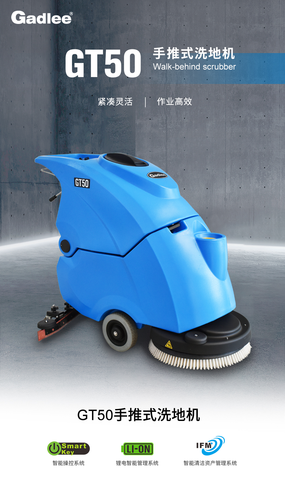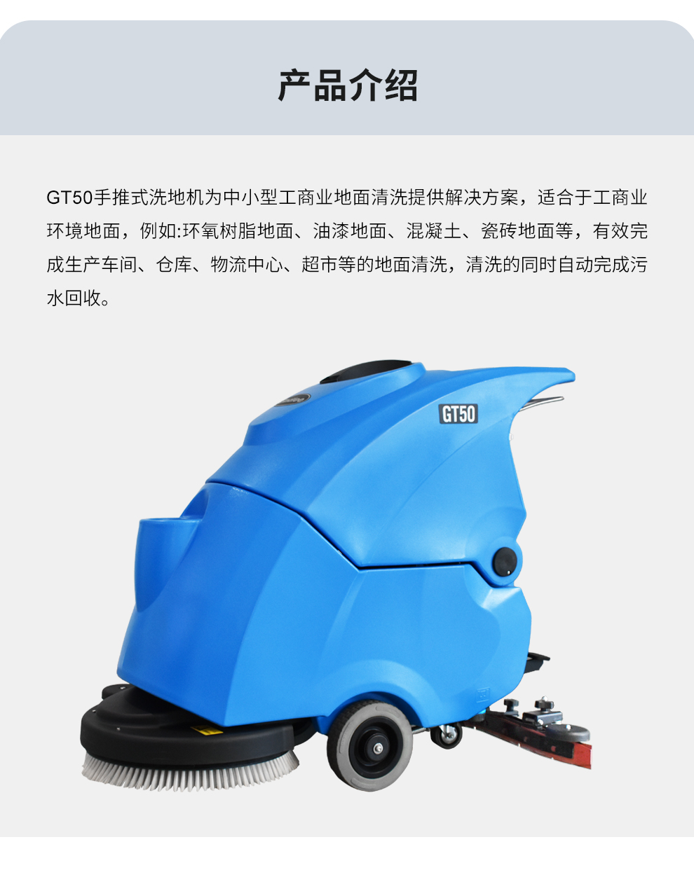 GT50手推式洗地机为中小型工商业地面清洗提供解决方案,适合于工商业环境地面,例如:环氧树脂地面、油漆地面、混凝土、瓷砖地面等,有效完成生产车间、仓库、物流中心、超市等的地面清洗,清洗的同时自动完成污水回收。