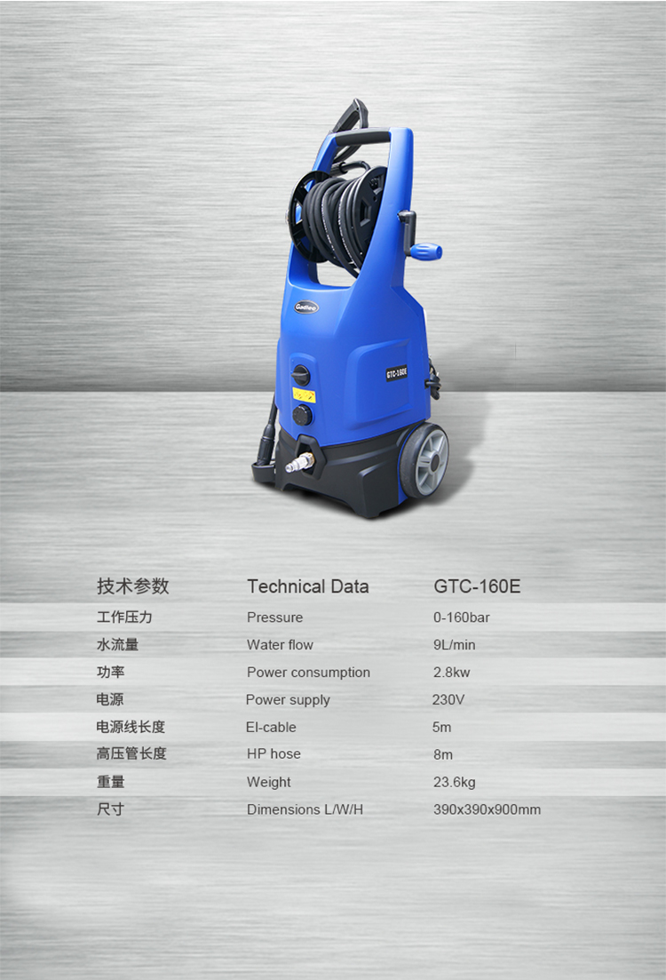 GTC-160E,设计精巧、灵活方便的冷水高压清洗机,采用节省空间的立式设计,符合人体工程学的手柄及脚轮设计,使设备便于操作及移动。有效的清洗能力和经济性,使其能够应用到不同行业,适用于生产车间、酒店物业的日常保洁和汽车及机械设备快速的清洗。