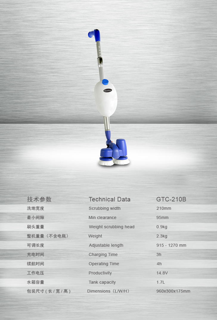 嘉得力 GTC-210B 边角清洗机操作简便、经济实用!2.3公斤设计使得它尤其适合于只能通过人工方法开展清洗工作的狭窄区域。 GTC-210B 经过人体工学考量,具备伸缩手柄及可调刷头角度设计。大容量锂电保证续航时间长达 4小时。配备的刷头为难以到达的区域,如边角、缝隙而设计。只须把刷头安装到卡槽上便可开展工作,灵活更换。