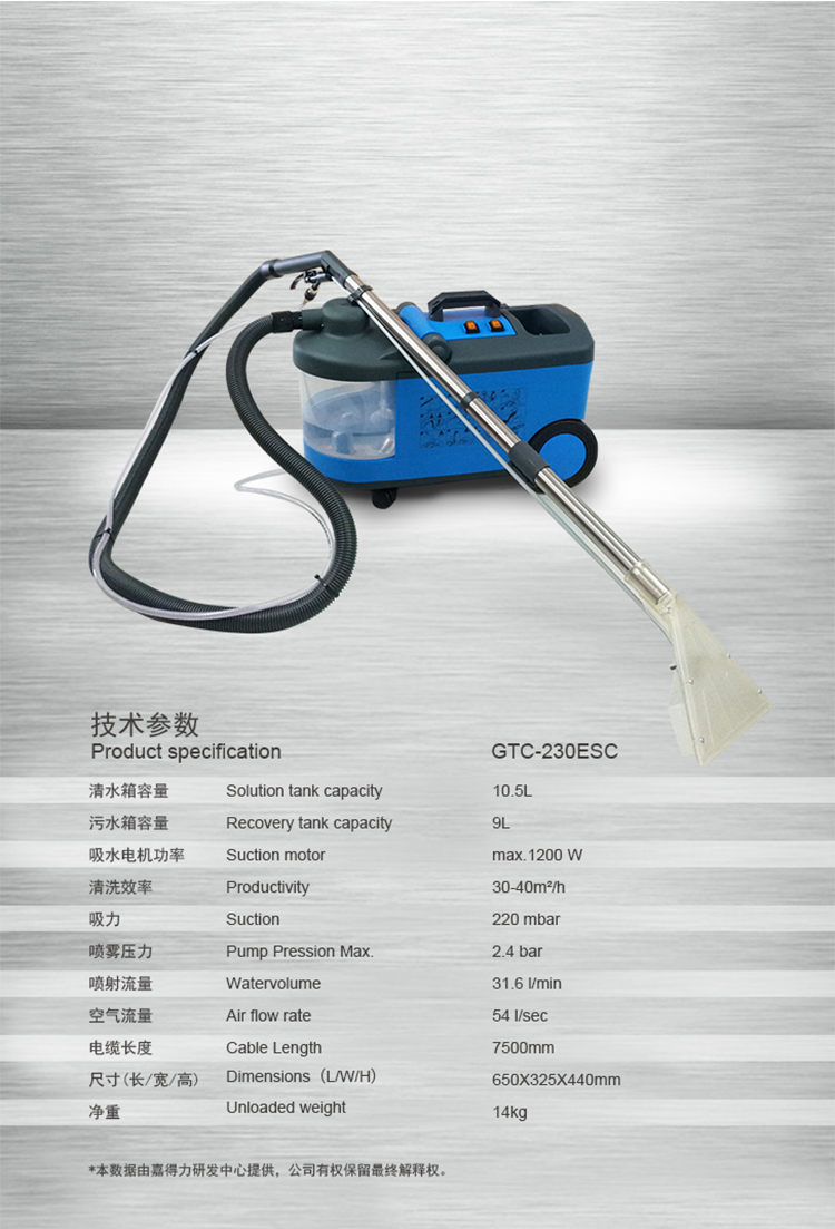 Gadlee GTC-230ESC 多功能抽洗机,集清洗扶手电梯、硬地面、地毯等多功能于一体,喷-吸二合一功能,在有效清洗的同时快速吸干清洗表面,可配合各种配件,为用户提供多用途清洗方案。