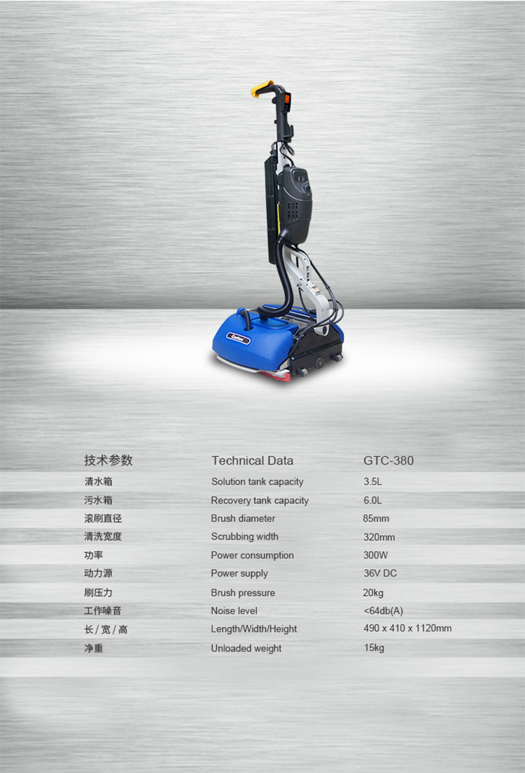 GTC-380 小型洗地机配备锂电池,结构紧凑,高性能清洁。适用于所有地板类型,包括部分地毯。双滚刷在两个工作方向上进行清洗、清扫和干燥。