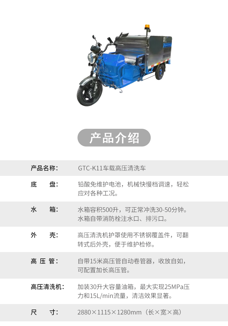 GTC-K11车载高压清洗车是为城市环卫,户外清洗保洁专门设计的一款简便实用型产品,品质有保证,能效清除建筑物,地面灰尘、污渍,可更高效的清洗环卫站、公交车、工程车辆等,可实现一机多用,是城市保洁、环卫、建筑工矿企业理想的户外冲洗产品。