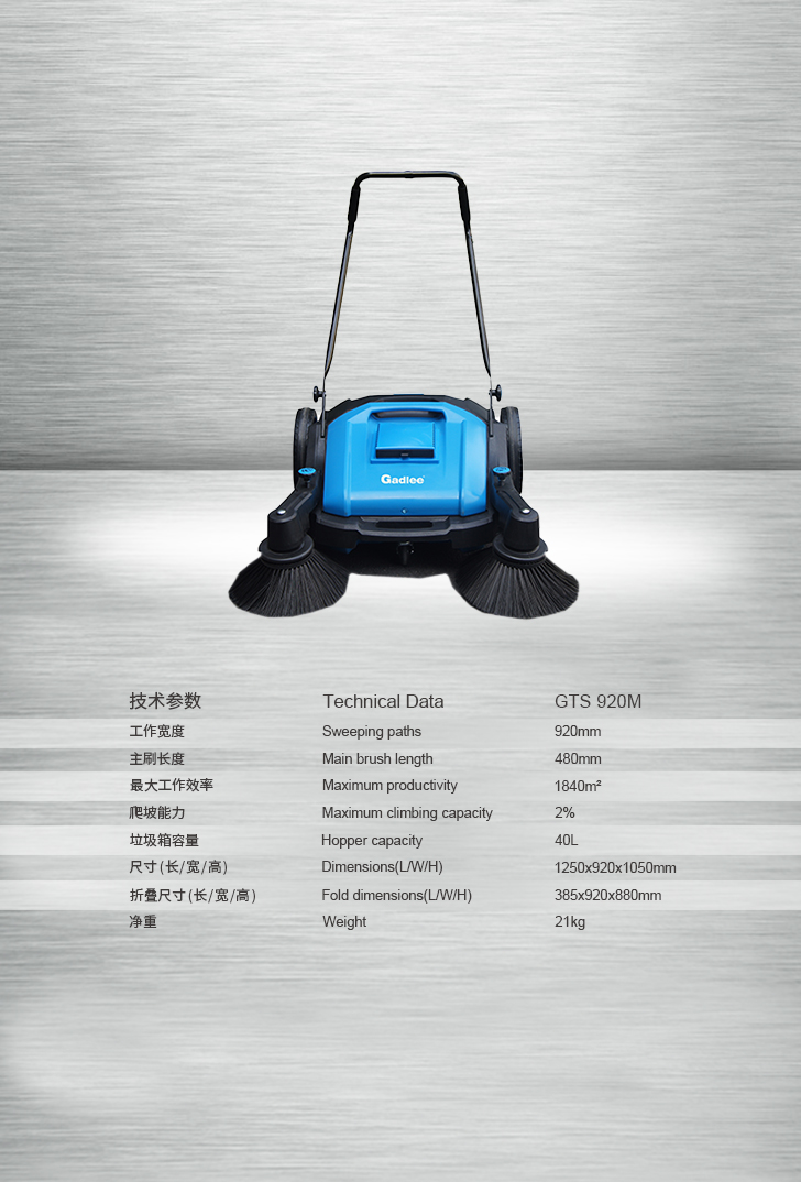 GTS-920M 是一款非常高效的手动式扫地机,适合清扫颗粒、碎石、玻璃、树叶等垃圾。GTS 920M工作效率高达 1840m²/每小时,比传统手工扫把清扫方式效率快多至6倍,只需推动即可完成灰尘、树叶、垃圾的清扫。