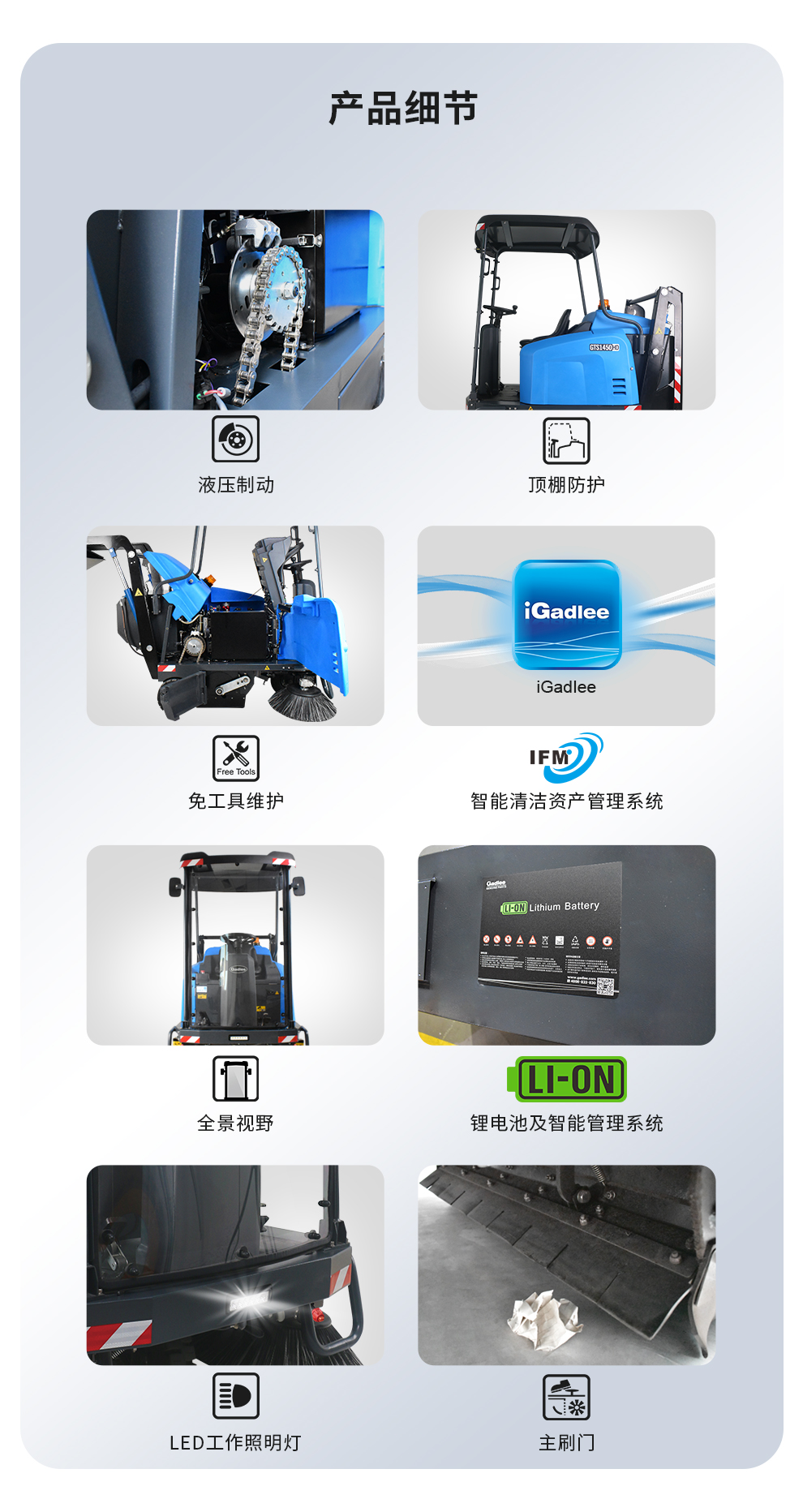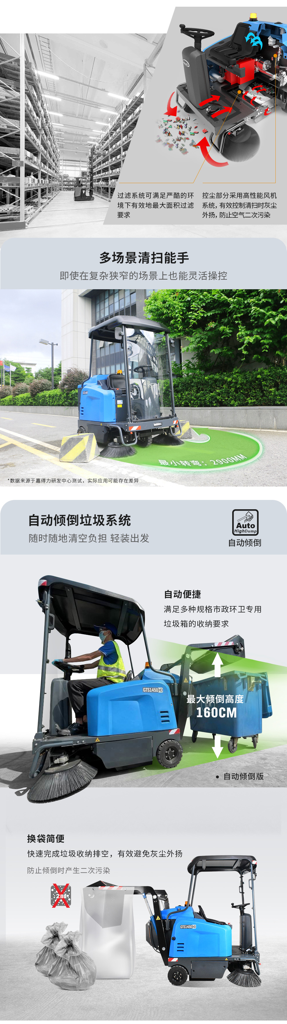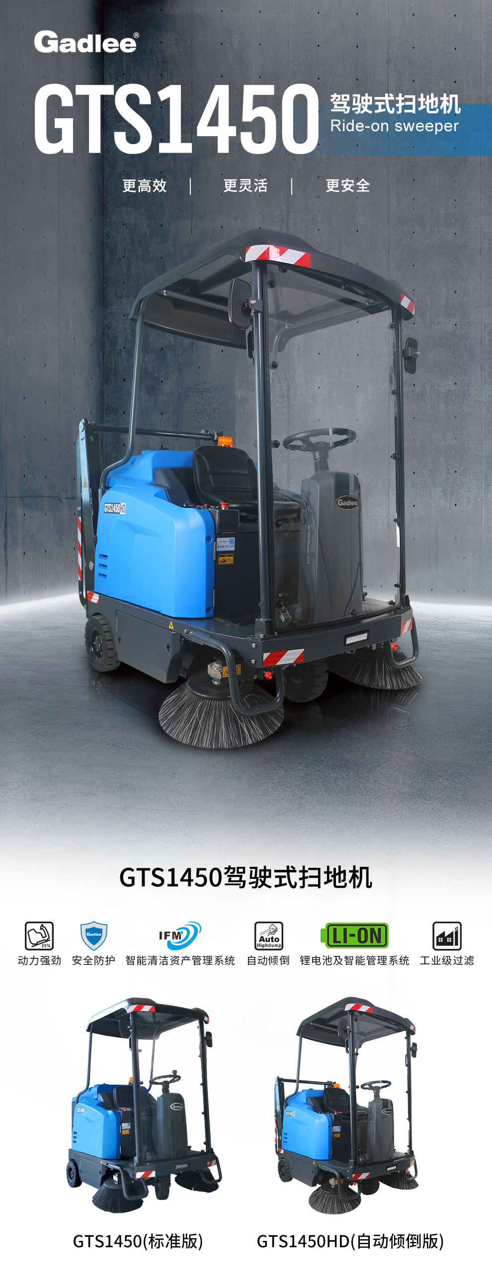 Gadlee GTS1450HD驾驶式扫地机性能卓越,配备全自动垃圾高位倾倒系统,清扫效率高达10875m²/每小时,配备重工型过滤系统(PTFE)比传统过滤系统提供高达6倍寿命,专为大面积的室内外清扫任务而设计,如厂区外道路,工业厂房,站台,大型物流仓库等等。