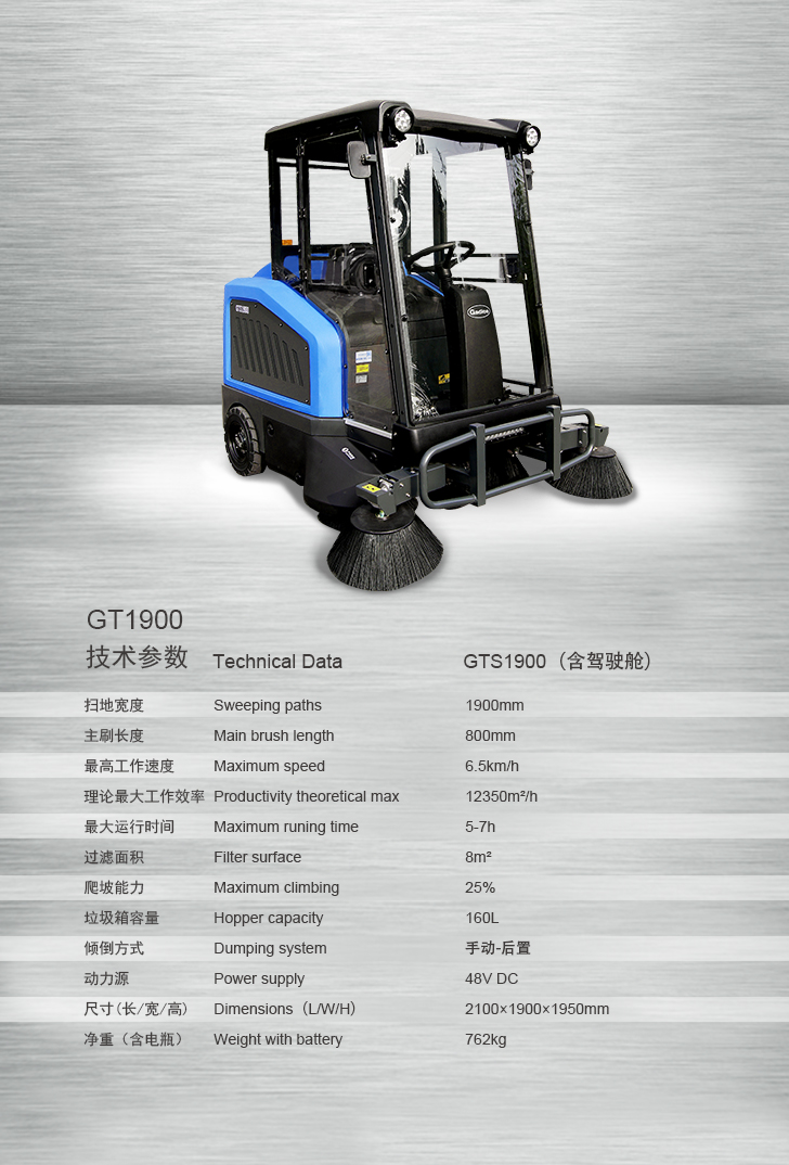 GTS1900驾驶式扫地机为地面清扫提供解决方案,能同时应付微尘及有大块的垃圾碎片的重工业环境,适合清扫公共区域及大型物流区域,如物业小区仓库,装卸区及停车场等。