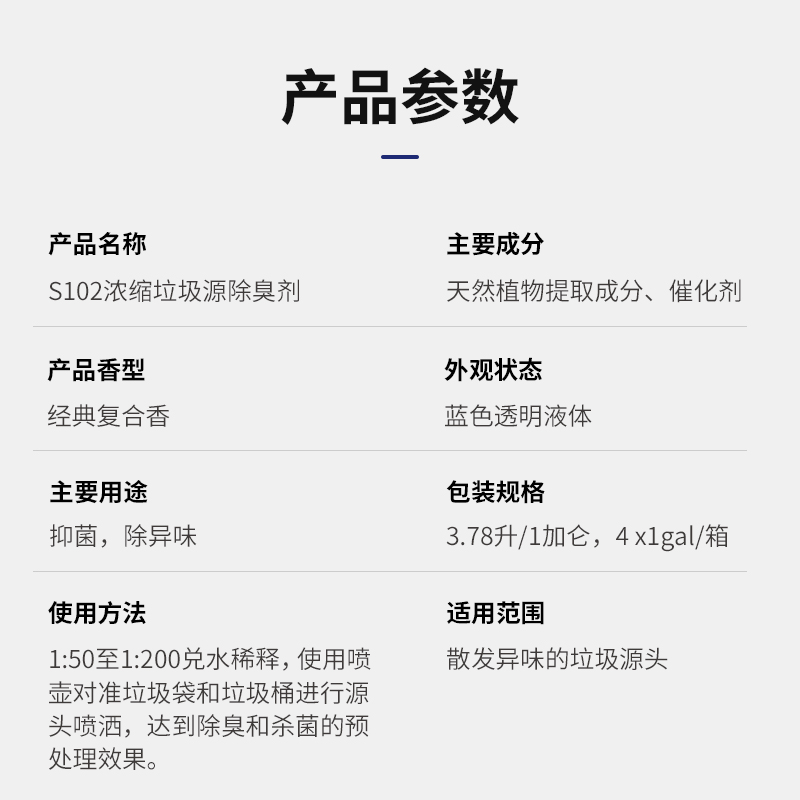 浓缩配方,携带方便,防腐蚀,低刺激性;适用于垃圾源头的人工除臭,防止垃圾在运输途中的臭味散发。植物配方,具有抑菌功能。